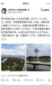 数々のトラブルを経てようやく運行開始となった古墳を見渡す気球ですが、早速搭乗した吉村知事がこんな投稿をしていました。