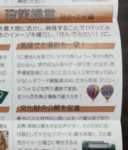 初めての大綱質疑の時点では、まだ百舌鳥古墳群の世界遺産の申請段階でしたから、当局は「要望のみにとどめてほしい。答弁を求めないでほしい。」と言ってきました。