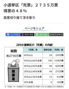 死に票の率が50%を超えた選挙区が約半分。ちなみに私の大阪16区では、59%が死に票です。