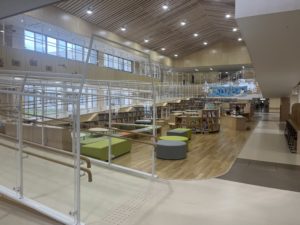 先述のエントランスの図書室は、地域の学校の遠足の目的地にもなっているそうです。すぐとなりが体育館なので、そこも含めて、遠足で来た子どもたちが遊び、そして支援学校の子どもたちと交流していきます。