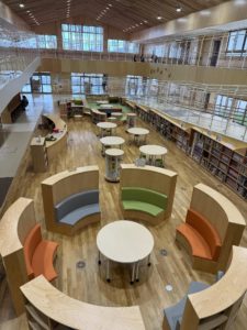 校舎に入ってすぐにあるのが、エントランス空間にもなっている図書室です。解放感いっぱいで、登校時にここで本を読んで、気持ちを落ち着かせて教室に向かう子も多いそうです。
